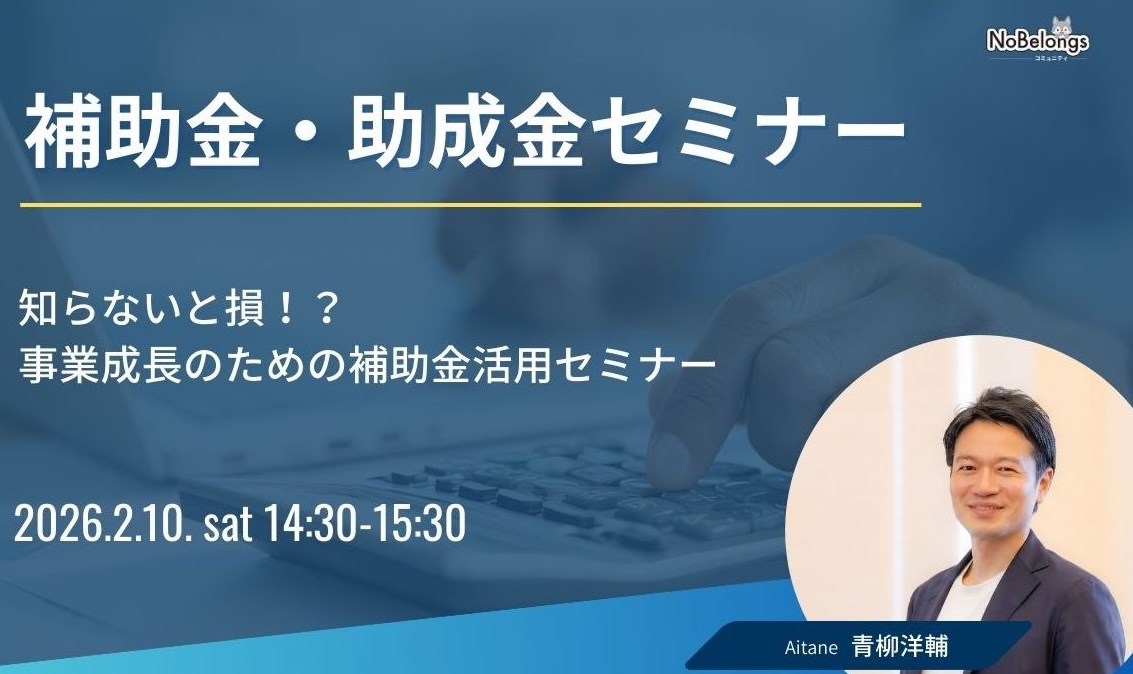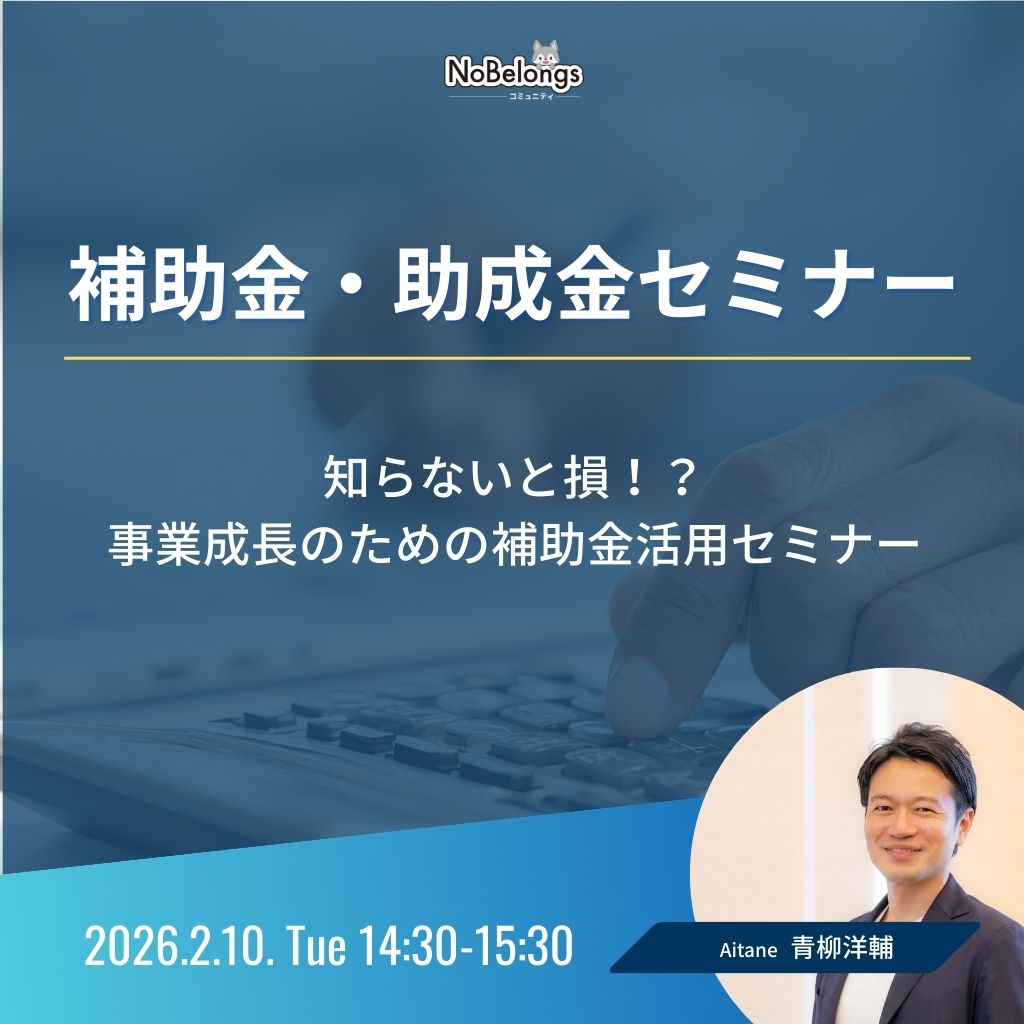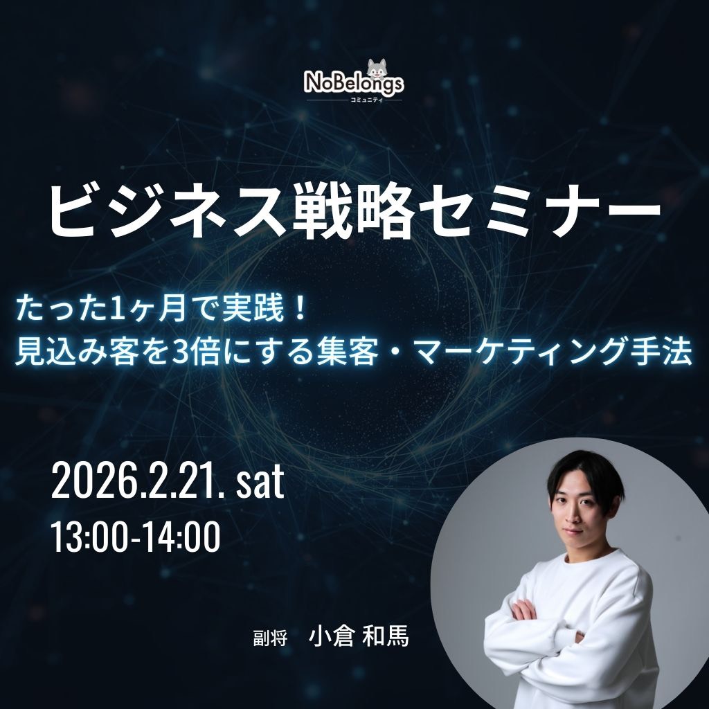詳しく見る 新宿ポーカー交流会 開催日 2026年2月7日(土) 12:00~16:00 ジャンル 趣味会 / ポーカー交流会 住所 東京都新宿区新宿2丁目8-18 第1バーディートライビル4F 主催 NoBelongsコミュニティ 参加可能 定員9名 残り6枠 新宿の好立地会場で開催! 初心者から上級者まで楽しめる交流の場! 新宿ポーカー交流会は、ポーカーを通じて人とつながるカジュアルな交流イベントです! … 詳しく見る 詳しく見る ゆるともナイト 開催日 2026年2月7日(土) 19:30~21:30 ジャンル 趣味会 / 友達作り 住所 東京都新宿区新宿1-15-7 新宿御苑ハイツ605号 主催 NoBelongsコミュニティ 参加可能 定員15名 残り10枠 友人作りイベント『ゆるともナイト』は、赤坂で気軽に参加できる少人数交流会です! 初参加や人見知りの方でも話しやすい雰囲気で、自然と会話が広がります… 詳しく見る 詳しく見る 新宿ビジネス交流会 開催日 2026年2月10日(火) 13:00~14:30 ジャンル ビジネス交流会 住所 東京都新宿区西新宿8-19-1 小林ビル512 主催 NoBelongsコミュニティ 参加可能 定員15名 残り10枠 「フリーランス」「個人事業主」を支援する法人、株式会社NoBelongsが手掛けるビジネス交流会。 西新宿徒歩5分の好立地!フリーランス集まれ!! 詳しく見る 詳しく見る 補助金・助成金セミナー 開催日 2025年2月10日(火) 14:30~15:30(13:00~14:30「ビジネス交流会」) ジャンル セミナー / 補助金・助成金 住所 新宿区西新宿8-19-1 小林ビル512 主催 NoBelongsコミュニティ 株式会社Aitane 青柳洋輔 参加可能 定員10名 残り5枠 本セミナーでは、補助金の基本的な仕組みから解説し、どんな事業が対象になるのかを整理します。 その上で、よくある誤解や注意点も紹介しながら補助金に関し… 詳しく見る 詳しく見る ゴルフ交流会 開催日 2026年2月10日(火) 19:30~21:30 ジャンル 趣味会 / ゴルフ会 住所 東京都港区三田4-19‐27 『高輪パームビル B1』 主催 NoBelongsコミュニティ 参加可能 定員8名 残り2枠 待望のゴルフイベントを開催! ビジネスの場面でも多く嗜まれているが、「未経験」の方も多く始めるハードルが高い「ゴルフ」を初心者〜中級者向けにイベント… 詳しく見る 詳しく見る 中目黒ビジネス交流会 開催日 2026月2月18日(水) 19:30~21:30 ジャンル ビジネス交流会 住所 東京都目黒区上目黒3丁目1−3 プライムアーバン中目黒 2F 主催 NoBelongsコミュニティ 株式会社SwinP 参加可能 定員10名 残り5枠 ⭐️安心・安全・高評価⭐️ 株式会社NoBelongが主催を行います!参加者内の過度な営業防止宣言‼️ 東京にも神奈川にも近い "中目黒" で、「フリーランス」「経営… 詳しく見る 詳しく見る 横浜フリーランス交流会 開催日 2026年2月20日(金) 19:30~21:30 ジャンル ビジネス交流会 住所 神奈川県横浜市西区高島 2丁目11-2 スカイメナー横浜 724号室 主催 NoBelongsコミュニティ 参加可能 定員15名 残り3枠 ⭐️安心・安全・高評価⭐️ 株式会社NoBelongが主催を行います!参加者内の過度な営業防止宣言‼️ 東京に次ぐ、大都市の「神奈川県横浜市」に”在住”・”在勤”のビ… 詳しく見る 詳しく見る ビジネス戦略セミナー 開催日 2025年2月21日(土) 13:00~14:00 住所 参加申し込み後、Zoomリンクを共有いたします。 主催 NoBelongsコミュニティ 副将 小倉和馬 参加可能 定員10名 残り5枠 オンライン開催の『ビジネス戦略セミナー』は、自宅やオフィスから気軽に参加できる実践的なビジネスセミナーです! 市場分析や強みの整理などの基礎から、… 詳しく見る 詳しく見る 【メンバー限定】オンライン懇親会 開催日 2026年2月23日(月) 13:00~14:00 住所 イベント参加者にオンラインリンクをお知らせします 主催 NoBelongsコミュニティ 参加可能 定員15名 残り5枠 オンライン懇親会の魅力は、人脈づくりや情報交換のチャンスが広がることです。 フリーランスや個人事業主など、普段一人で働く人にとっては貴重な交流の場と… 詳しく見る 詳しく見る 千葉ビジネス交流会 開催日 2026年2月27日(金) 19:30~21:30 ジャンル ビジネス交流会 住所 千葉県船橋市本町 1-31-26 アドアーズ 4階 主催 NoBelongsコミュニティ 参加可能 定員15名 残り2枠 ⭐️安心・安全・高評価⭐️ 株式会社NoBelongが主催を行います!参加者内の過度な営業防止宣言‼️ 千葉県船橋付近に”在住”・”在勤”のビジネスマン華金に飲みなが… 詳しく見る